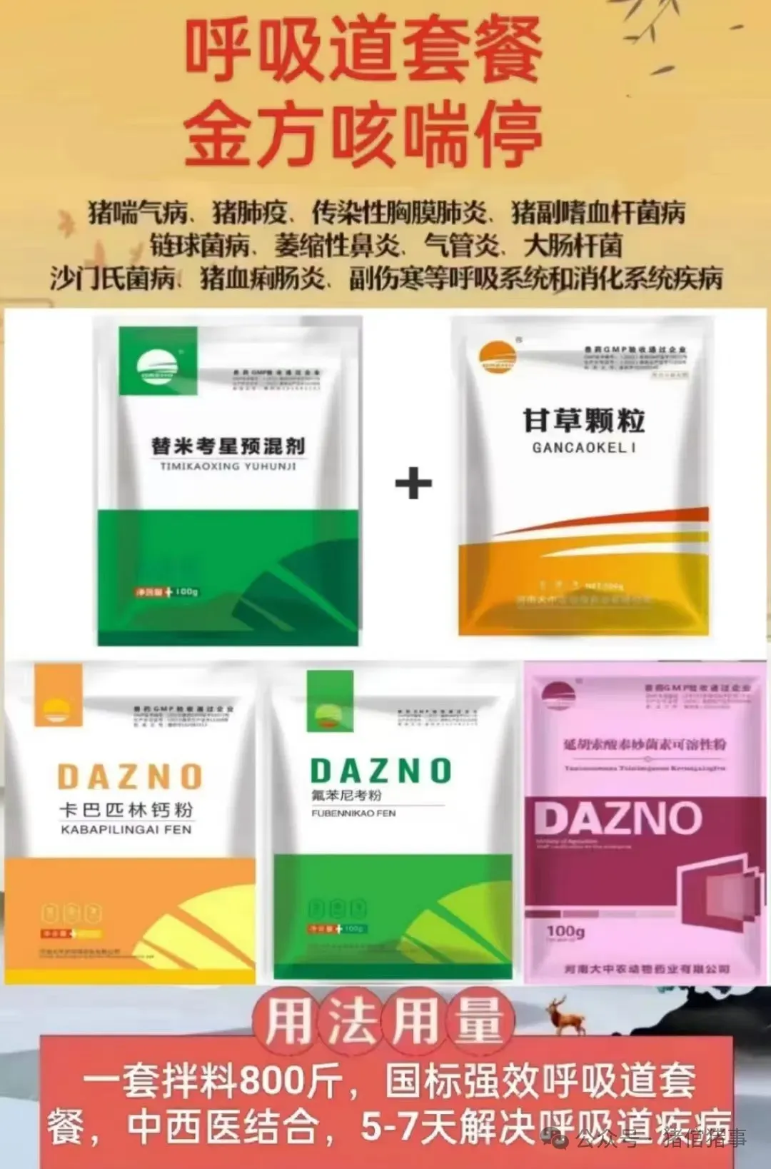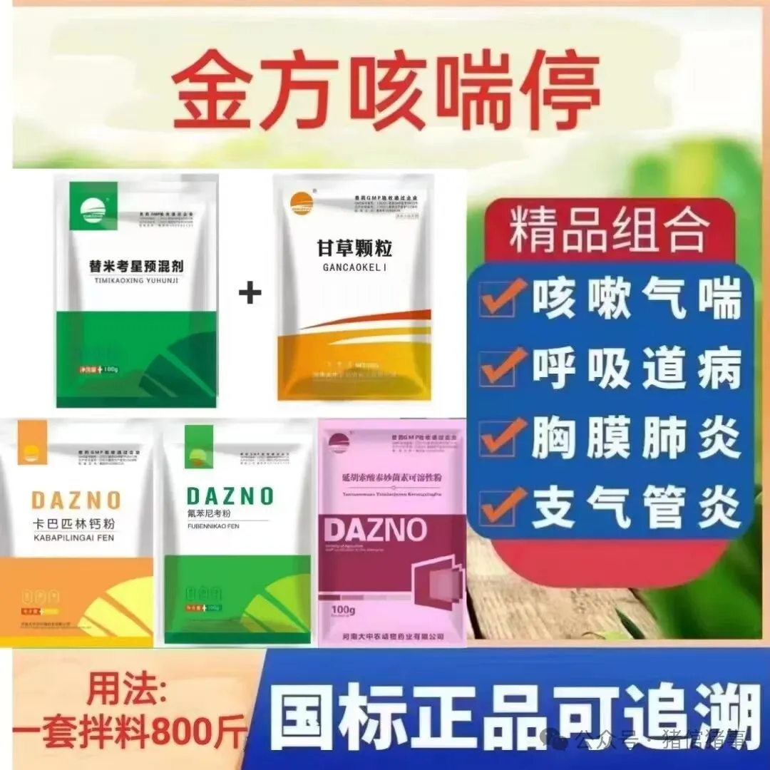 金方咳喘停:结合猪各阶段呼吸道发病特点,混合型呼吸道疾病、流行病学、发生发展过程以及病理变化原理、流行特征以及防控要点着手,以一个整体全面治标治本的角度量身打造的套餐,不但重视“强效抗生素”杀灭病原,消除症状,而且更加重视中草药的解毒、恢复抵抗力等功效,确保病猪经过治疗后快速恢复健康状态,增强对本病和其他病原的抗拒力,消除再次爆发本病,易感其他疾病等隐患。