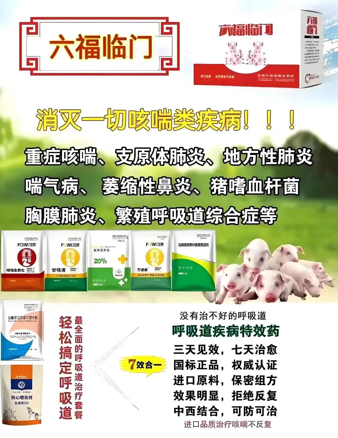 “诸稳康”用法用量:本品1000g拌料500-1000斤,根据猪场实际情况连用7-15天,可见效果如下: ?3天后猪群精神得到提升,饮水量明显上升; ?4天后猪群采食量、饮水量明显提升,死亡率降低; ?5天后猪群症状缓解,猪群体表败血现象改观; ?7天后大群精神改善,发病猪只减少; ?15天后大群精神良好,猪群稳定。