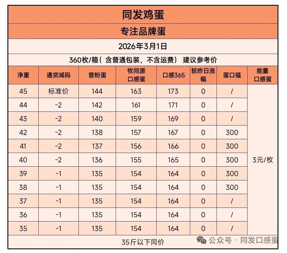 2026年3月1日贵港同发鸡蛋价格 养羊网 2026-03-01 2026年3月1日贵港同发鸡蛋价格以上价格为贵港同发鸡蛋平台公示的鸡蛋含包装成交结算价(上车价),仅供本平台渠道对接合作伙伴参考使用,不与其他任何报价做比较。 养羊网 2026-03-01 上一篇:2026 年 3 月 2 日全国猪价分析与价格表 下一篇:【猪价预测】3月3-3月5 猪价预测 您可能还会对下面的文章感兴趣111: 相关文章 当你真的开始研究赚钱,就会发现… 2026年1月8日鸡蛋价格--涨【每日五次更新】---蛋价持续更新中 【2月11日】毛鸡、鸡苗、鸡蛋价格预报 【明天猪价】2026.2.25全国猪价 (已更新)