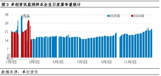 需求端来看,3月仍处于传统消费淡季,需求支撑乏力,难以对冲供应压力。春节后居民饮食结构趋于清淡,家庭库存消化接近尾声,但餐饮、团膳需求回暖缓慢,学校开学、旅游复苏对消费的拉动作用有限,终端市场仍处于“需求真空期”,预计3月日均屠宰量将呈现环比回落态势,屠宰企业开工率难有显著提升,对生猪价格难以形成有效支撑。
