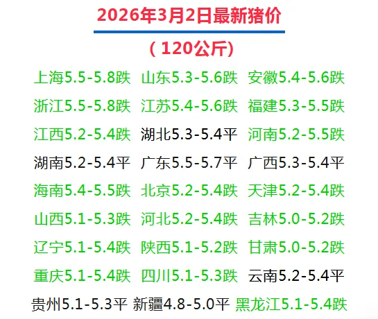 2026.3.2-明日全国最新猪价信息(猪价已更新!) 养羊网 2026-03-01 2026.3.2-明日全国最新猪价信息(猪价已更新!)湖南义君同创明日最新猪价(仅供参考) 养羊网 2026-03-01 上一篇:【明日猪价】 2026.3.2 小幅偏弱 下一篇:【生猪价格】2026.3.2日,明日猪价早知道 您可能还会对下面的文章感兴趣111: 相关文章 花了6块在菜场买的猪血,正宗不 科右中旗关工委深入新佳木苏木调研养羊项目 贵阳纯吃攻略(上) 2025年4月13日全国各地生猪价格信息