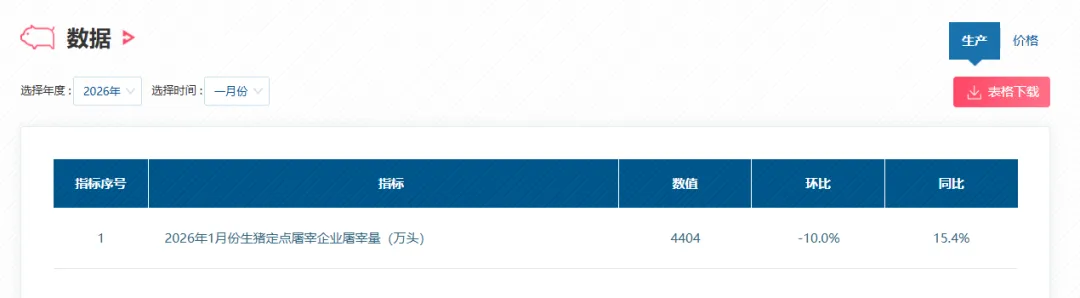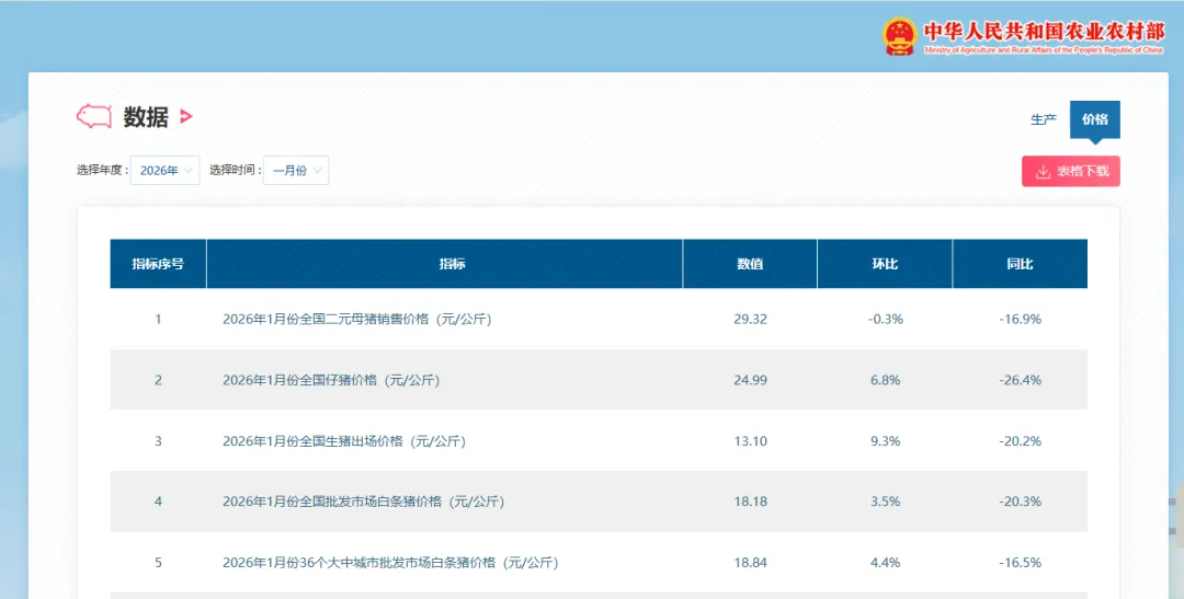农业农村部昨天发布的最新生猪数据显示,2026年1月份,全国生猪出场价格为13.10元/公斤,环比上涨9.3%,同比下降20.2%。同期,全国二元母猪销售价格29.32元/公斤,环比微降0.3%;仔猪价格24.99元/公斤,环比上涨6.8%。在屠宰方面,1月份生猪定点屠宰企业屠宰量为4404万头,环比下降10.0%,同比增长15.4%。
