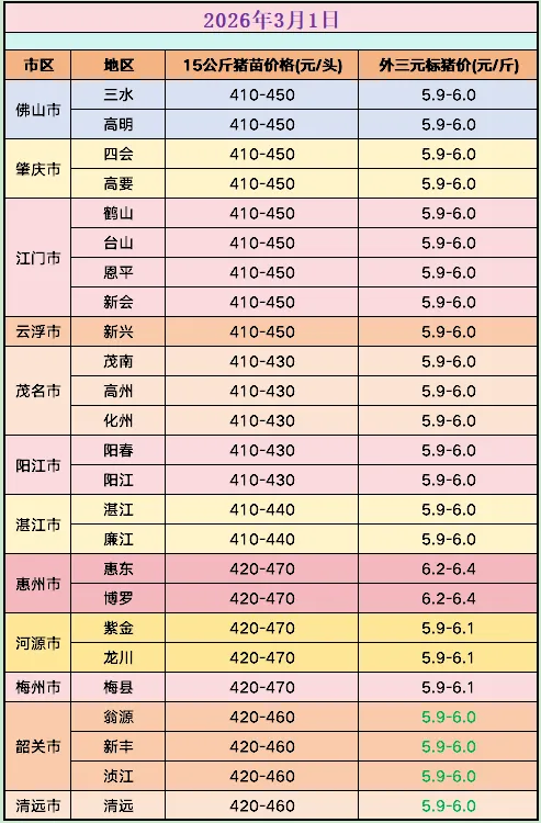 3月1日猪价速递 养羊网 2026-03-01 3月1日猪价速递广东猪苗全省各报410~470元,毛猪报5.9~6.4元,除韶关和清远微跌0.1元外,其它各地都稳定。(行情仅供参考) 养羊网 2026-03-01 上一篇:2026年3月2日 鸡蛋价格 下一篇:2026.03.02-明天猪价 您可能还会对下面的文章感兴趣111: 相关文章 【超前 猪价 预测】3月2日~3月4日!全国猪价!!!!!!!!?!?!! 怎么成为千万富翁? 2025年4月13日全国各地生猪价格信息 怪不得超市卖不过电商呢