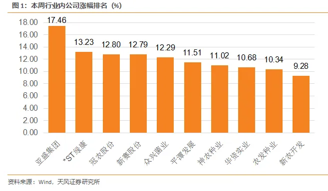 最新交易周(2026年2月23日-2026年2月27日),农林牧渔行业+4.01%,同期上证综指、深证成指、沪深300变动分别为+1.98%、+2.80%、+1.08%。个股中涨幅靠前的分别为:亚盛集团+17.46%、*ST绿康+13.23%、冠农股份+12.80%、新赛股份+12.79%、众兴菌业+12.29%、平潭发展+11.51%、神农种业+11.02%、华资实业+10.68%、农发种业+10.34%、新农开发+9.28%。