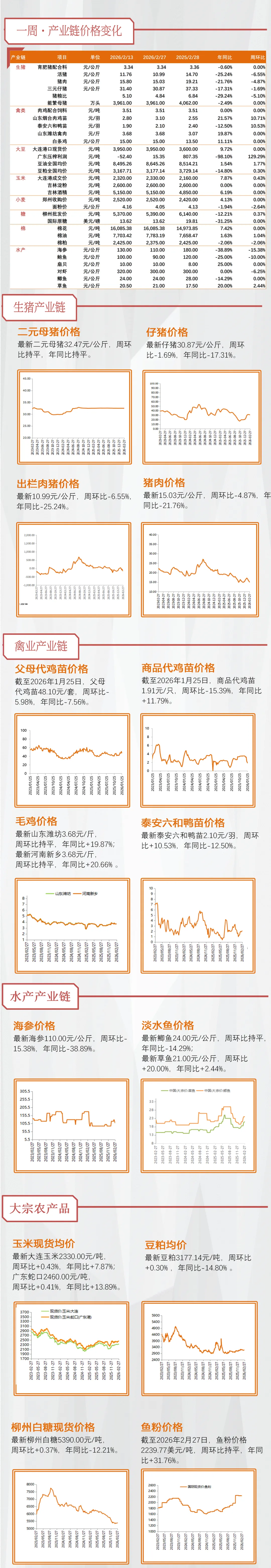 1)本周肉牛产业链各环节价格基本平稳。截至2月27日,育肥公牛出栏价格25.74元/kg,环比持平,同比+8.75%;犊牛价格33.81元/kg,环比持平,同比+37.61%;淘牛价格20.58元/kg,环比+1.38%,同比+25.11%(数据来源:钢联)。奶价仍处低位调整阶段,截至2月12日,生鲜乳价格3.04元/kg,环比持平、同比-2.25%(数据来源:wind)。2)奶磨底,肉起势。肉牛方面,国内长亏损周期叠加深度亏损,驱动能繁母牛深度去化。进口配额制落地、关税政策以及全球牛肉供给趋紧,共同抑制国内牛肉进口数量。进口端供给收缩与国产端供给偏紧形成共振,后续涨幅与上行持续性有望超市场预期。奶牛方面,去化趋势仍在,奶价周期拐点值得期待。截至2026年1月奶牛存栏量已累计去化9.1%,叠加当前奶价持续低位运行且已跌破上一轮周期底部,行业供需失衡与价格压力凸显,产能去化预计将持续推进,奶价弹性有望更加乐观。