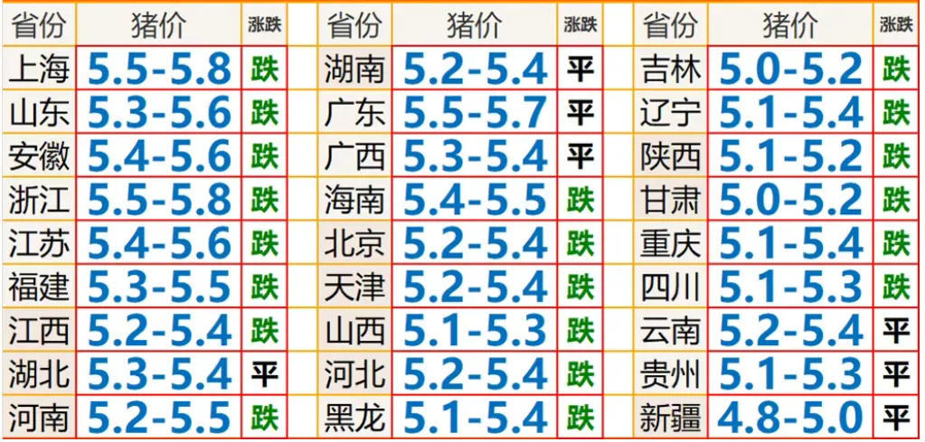 2026.3.2今日猪价格表┃3.2全猪价今日涨跌表 养羊网 2026-03-02 2026.3.2今日猪价格表┃3.2全猪价今日涨跌表 养羊网 2026-03-02 上一篇:3月2日猪价 | 又降了,短期内低位震荡! 下一篇:2026年3月2日宁城鸡蛋价格早报 您可能还会对下面的文章感兴趣111: 相关文章 第39篇:什么是【猪周期】? 2025年4月13日全国各地生猪价格信息 【明天猪价】2月20日国猪价(已更新!) 鸡蛋2505走势策略分析3月20号