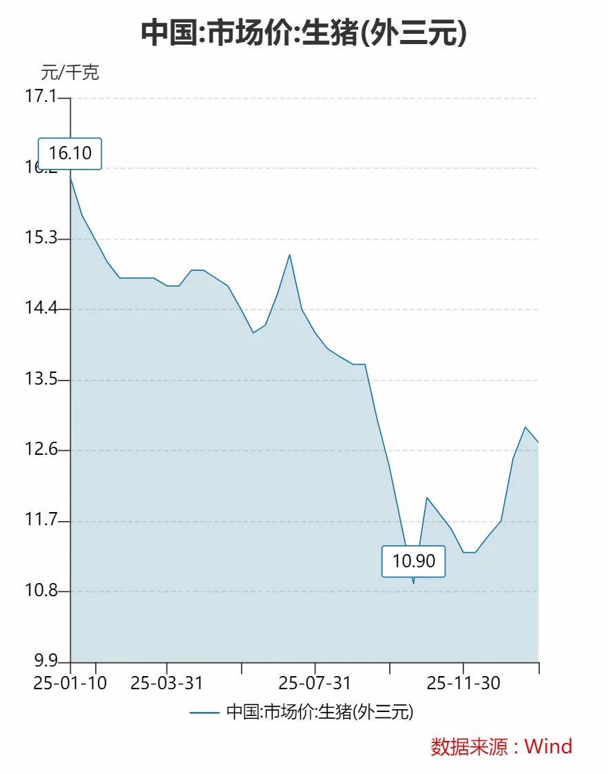 据国家统计局公布的数据,2025年1月上旬到3月下旬,生猪(外三元)价格从16.1元/公斤逐渐下降至14.7元/公斤,4月中旬小幅上涨至14.9元/公斤后下跌,6月上旬跌至14.1元/公斤,后微涨至7月上旬的15.1元/公斤。此后一路下跌,跌至10月中旬的全年最低点10.9元/公斤,后小幅反弹,在11元/公斤-12元/公斤左右徘徊。