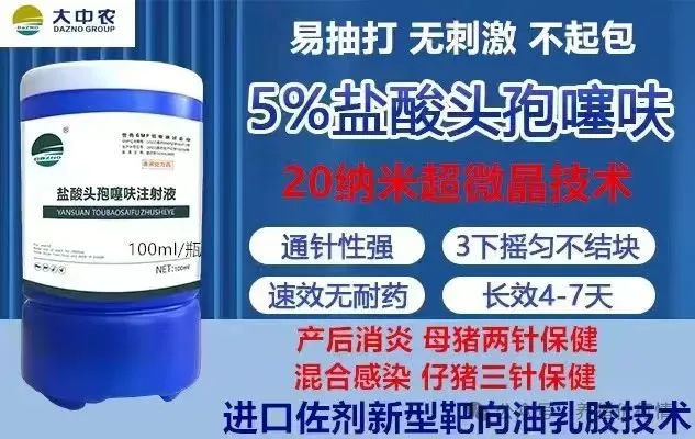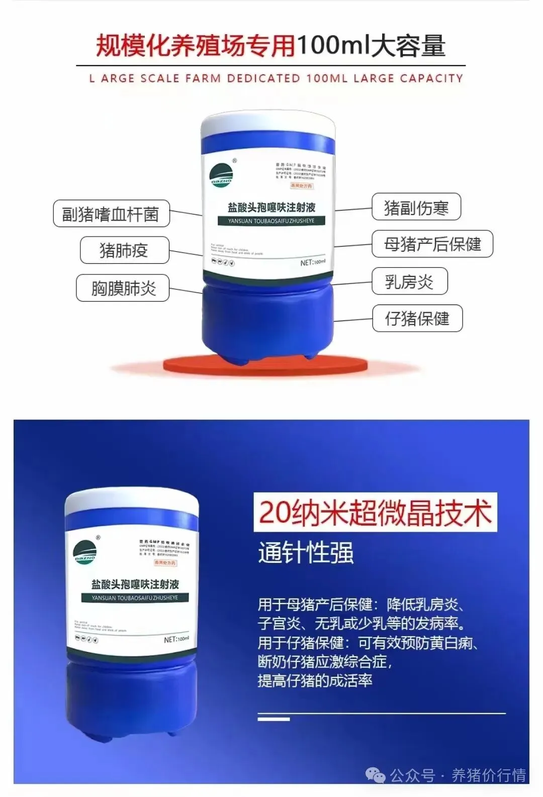 纳米微晶头孢原料,进口佐剂、乳胶技术等,易抽打、无刺激、不起包,药效持续168小时,给母猪和仔猪更好保护。