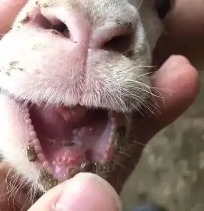 未断奶的羔羊常在口角、唇黏膜、齿龈上发生散发性小红斑,逐渐发展成为丘疹或小结节,继而形成水泡或脓疱,此后相互融合,痂不断增厚,部分或整个口唇外翻,呈桑葚状隆起,后变为黑褐色痂块。这就是"烂嘴病"。
