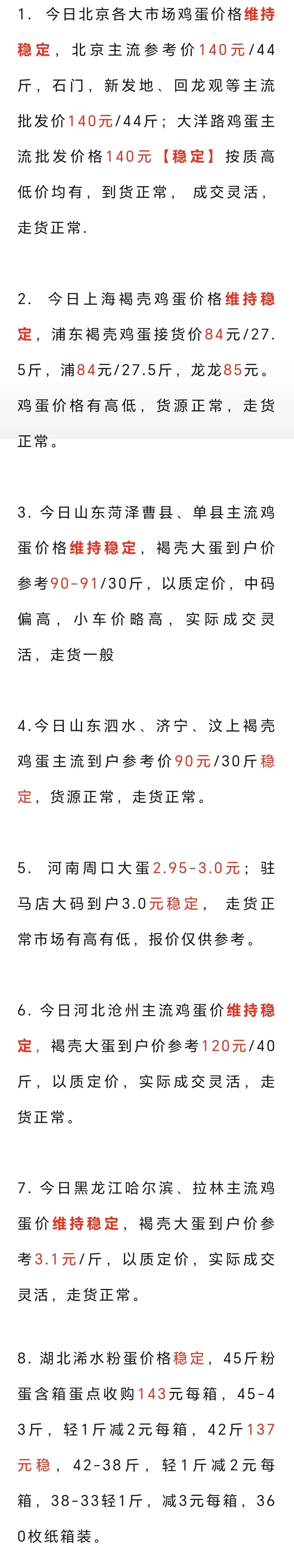 2026年3月3日各地鸡蛋价格(涨) 养羊网 2026-03-03 2026年3月3日各地鸡蛋价格(涨) 养羊网 2026-03-03 上一篇:明日(2026年3月4)鸡蛋价格预测 下一篇:3月3日昆明鸡蛋价格参考,昆明跌; 您可能还会对下面的文章感兴趣111: 相关文章 2025年4月13日全国各地生猪价格信息 2025年4月13日全国各地生猪价格信息 近期价格更新!!! 11月8日猪副行情