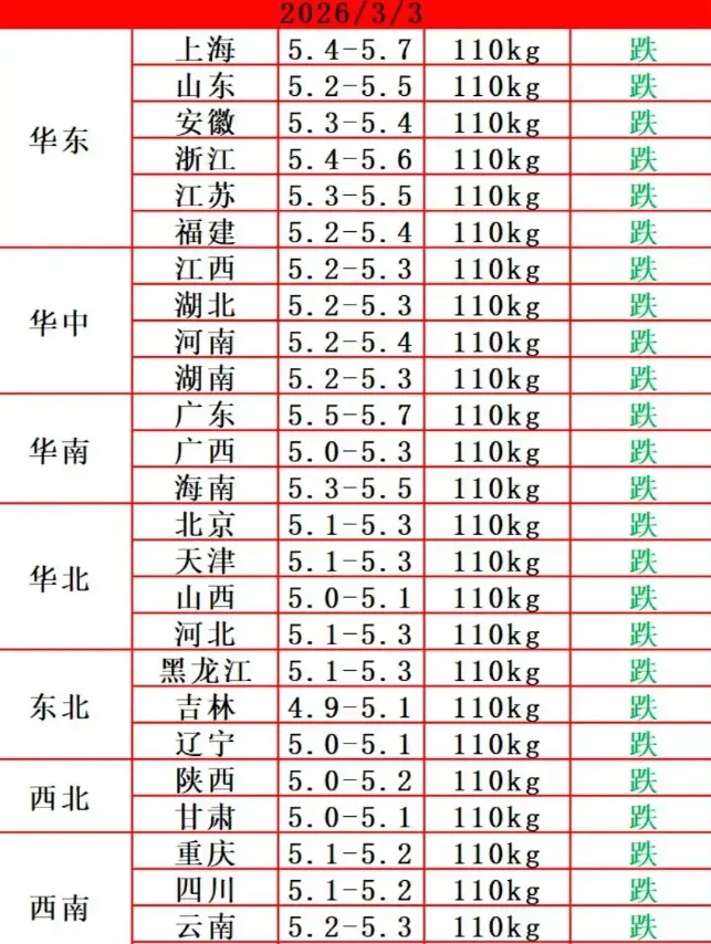 【柯恩·今日猪价】3月3日生猪价格 养羊网 2026-03-03 【柯恩·今日猪价】3月3日生猪价格全国统一咨询热线:4001-116-116需要饲料请拨打订货热线赣州:0797-8462111南昌:0791-85776699漳州:0596-6831299常德:0736-5696855茂名:0668-7303717 养羊网 2026-03-03 上一篇:今日猪价 | 2026.3.3 全线下跌 下一篇:【明德牧业】3月3日鸡蛋价格早报 您可能还会对下面的文章感兴趣111: 相关文章 2025年4月13日全国各地生猪价格信息 近期价格更新!!! 我认识个人一场救助直播就收到5万礼物 2025年4月13日全国各地生猪价格信息