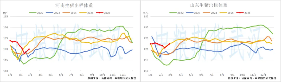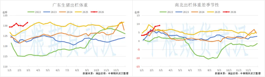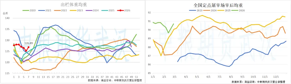 【生猪周度策略观察】年后猪价持续下跌何时筑底?————3.2随着春节假期结束,猪价迎来了进一步下跌。除了年后消费淡季带来的颓势外,年前行业去库程度一般也是压制价格的重要原因。 体重方面,根据涌益咨询数据,全国生猪出栏均重截至上周为126.89公斤/头,高于往年同期水平以及农历年同期水平,从屠宰场宰后均重来看亦是如此,这反应春节后猪企仍需在亏损中消化供应压力。