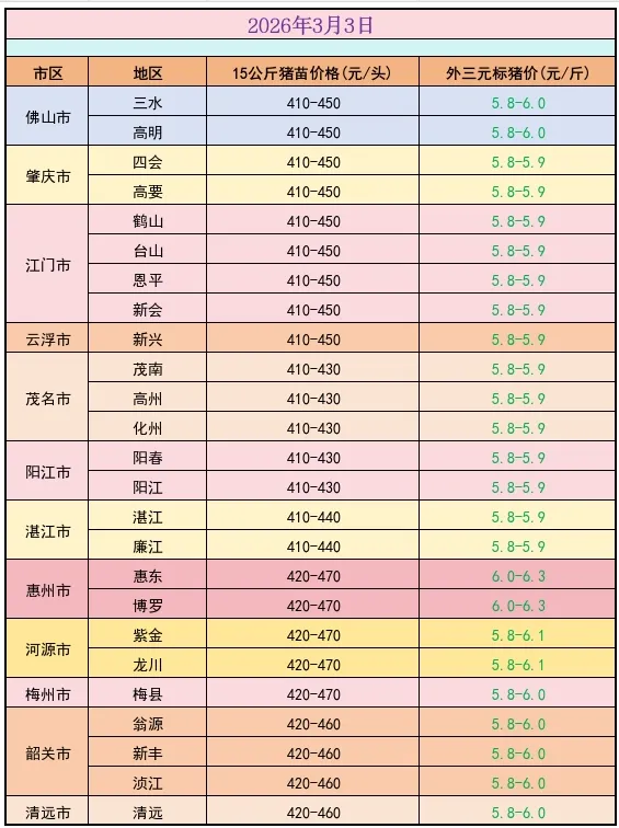 3月3日猪价速递 养羊网 2026-03-03 3月3日猪价速递广东猪苗全省各报410~470元,毛猪报5.8~6.3元,全省各地都微跌0.1元外。(行情仅供参考) 养羊网 2026-03-03 上一篇:一夜“跳水”,猪价下跌“六亲不认”!附:3月4日猪价 下一篇:3月3日:贵州、广西、广东鸡蛋价格;弱势难挡,向下调整,跌! 您可能还会对下面的文章感兴趣111: 相关文章 2025年4月13日全国各地生猪价格信息 养殖场租赁协议 2025年4月13日全国各地生猪价格信息 朋友们注意啦~1.23日青岛海鲜价格来啦