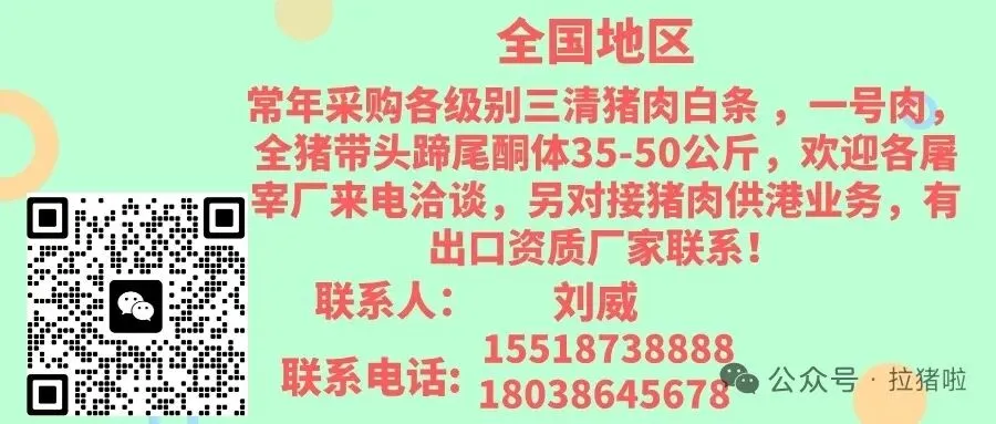全国地区 常年采购:各级别三清猪肉白条 ,一号肉,全猪带头蹄尾酮体35-50公斤,欢迎各屠宰厂来电洽谈,另对接猪肉供港业务,有出口资质厂家联系!刘威15518738888,18038645678