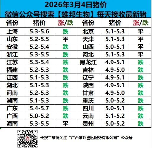 2.26.3.4/明天猪价 养羊网 2026-03-03 2.26.3.4/明天猪价 养羊网 2026-03-03 上一篇:【明日猪价】-2026年3月4日 下一篇:全国猪价继续普跌!整体偏弱运行!2026.03.04-明日猪价 您可能还会对下面的文章感兴趣111: 相关文章 2025年4月13日全国各地生猪价格信息 2024.05.25猪价分析预测,仅供参考 近期价格更新!!! 2025年4月13日全国各地生猪价格信息