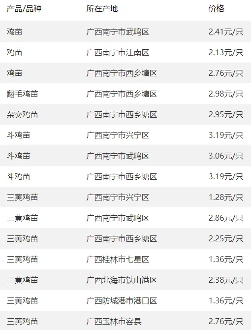 广西部分地区鸡苗价格