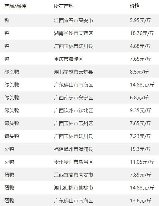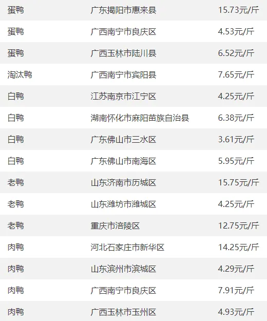 全国部分地区鸭的价格参考?