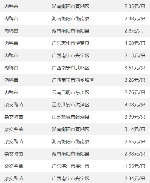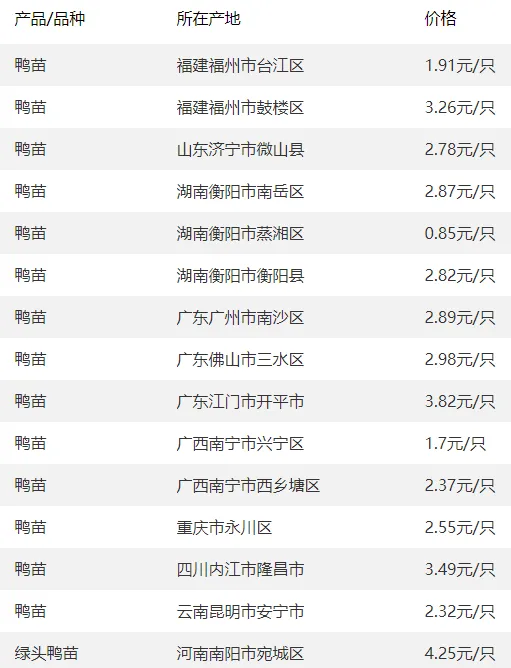 全国部分地区鸭苗价格参考