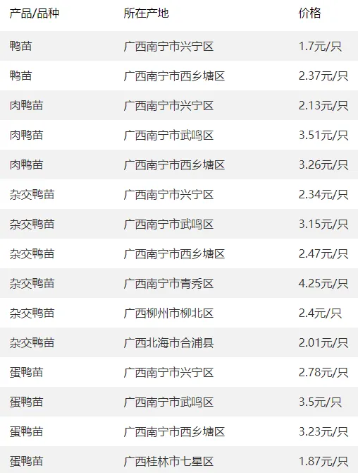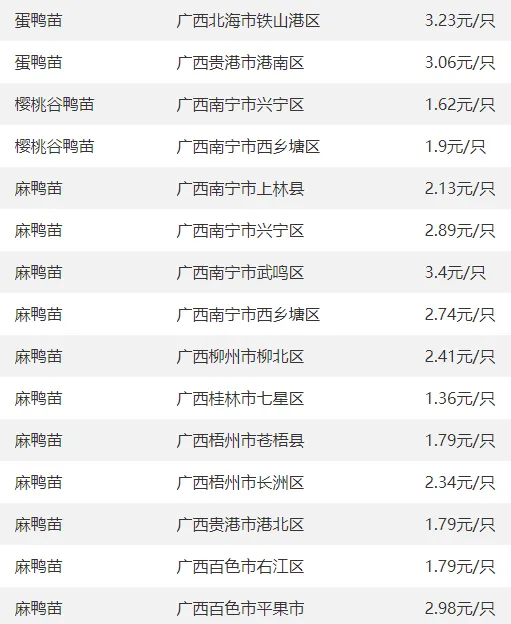 广西部分地区鸭苗价格参考