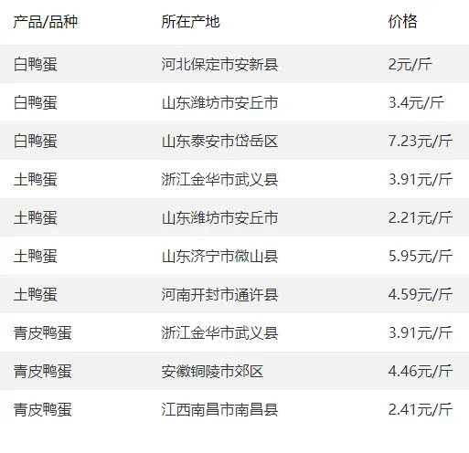 全国部分地区鸭蛋价格参考
