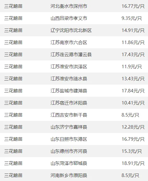 全国部分地区鹅苗价格参考