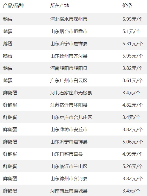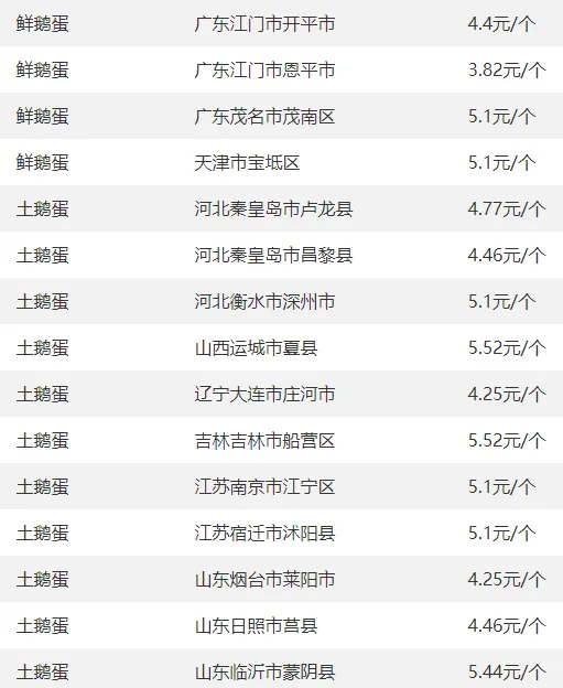 全国部分地区鹅蛋价格参考