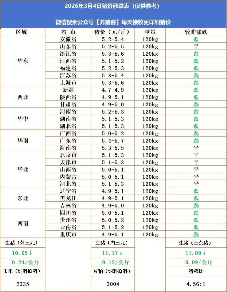 养猪客|2026.3.4|明天猪价分析(只供参考) 养羊网 2026-03-03 养猪客|2026.3.4|明天猪价分析(只供参考) 养羊网 2026-03-03 上一篇:3月3日广东地区猪价小幅下跌 下一篇:《2026上半年畜牧生死局:猪价磨底11元,牛羊逆势涨价!你的养殖场该保猪还是扩牛羊?》 您可能还会对下面的文章感兴趣111: 相关文章 马来西亚猪肉物价 二?相关 散养土鸡蛋怎么样? 在烟台一个月入账12w突然对很多事情都无感