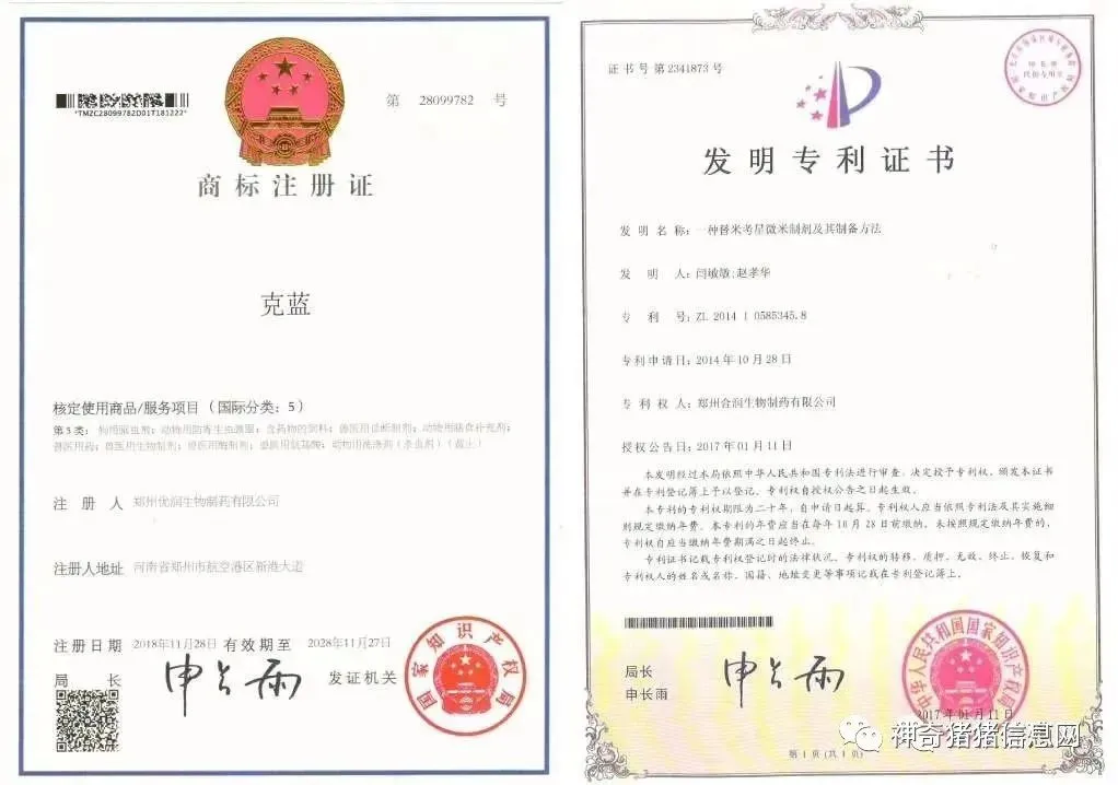 (1)研究历程:克蓝是畅销产品从08年开始就已经使用,历经十多年年逐步完善,2016年初上报农业部门经过一年的论证研究证实,证明克蓝套餐,针对蓝耳,圆环,副猪,支原体,链球菌,具有很好的净化治疗效果,最后颁发克蓝套餐专利证书让更多养殖朋友信任产品,并且名字申请了商标证书,是具有唯一性,专属优润集团专用。下图是产品专利证书,商标注册证书