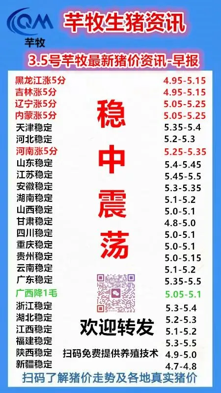 2026年3月5号芊牧最新猪价资讯-早报(稳中震荡) 养羊网 2026-03-04 2026年3月5号芊牧最新猪价资讯-早报(稳中震荡) 养羊网 2026-03-04 上一篇:今日猪价| 2026.3.5.明天猪价(只供参考) 下一篇:2026年3月5日大鸿门猪价:稳中震荡(二育少量入场、支撑有限、谨慎操作) 您可能还会对下面的文章感兴趣111: 相关文章 2026年2月5日-今日猪价 【明日猪价】稳中伴涨!市场看稳、看涨、看跌情绪并存 猪价一览|2026年2月6日 (明日猪价早知道) 2025年4月13日全国各地生猪价格信息