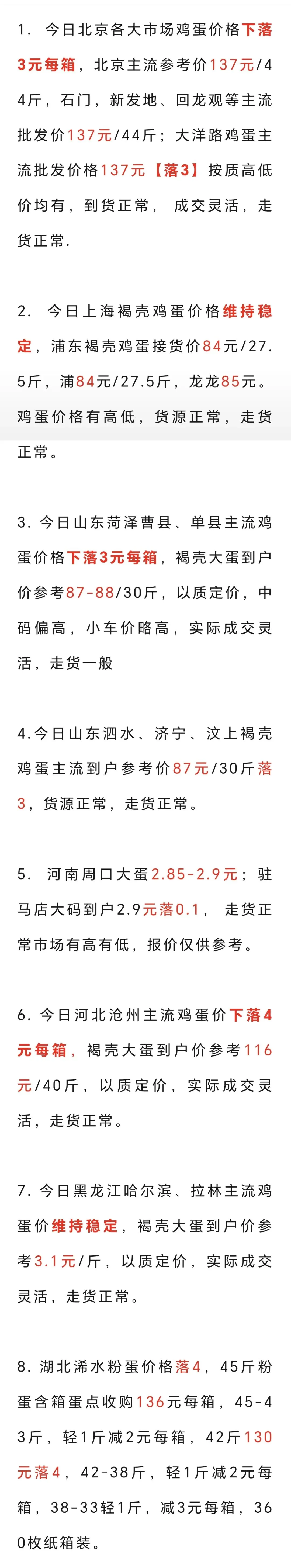2026年3月5日各地鸡蛋价格 养羊网 2026-03-05 2026年3月5日各地鸡蛋价格 养羊网 2026-03-05 上一篇:明日(2026年3月6)鸡蛋价格预测 下一篇:(2026年 3月5日)鸡蛋价格最新报价 您可能还会对下面的文章感兴趣111: 相关文章 2025年8月5日全国各地生猪价格信息 明日猪价——2026年03月05全国生猪价格! 羊泰壮 —— 包膜胍基乙酸,肉羊育肥增重快 2025年4月13日全国各地生猪价格信息