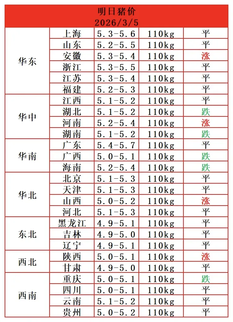 3月5日最新猪价通知,目前猪价全国下跌一片绿