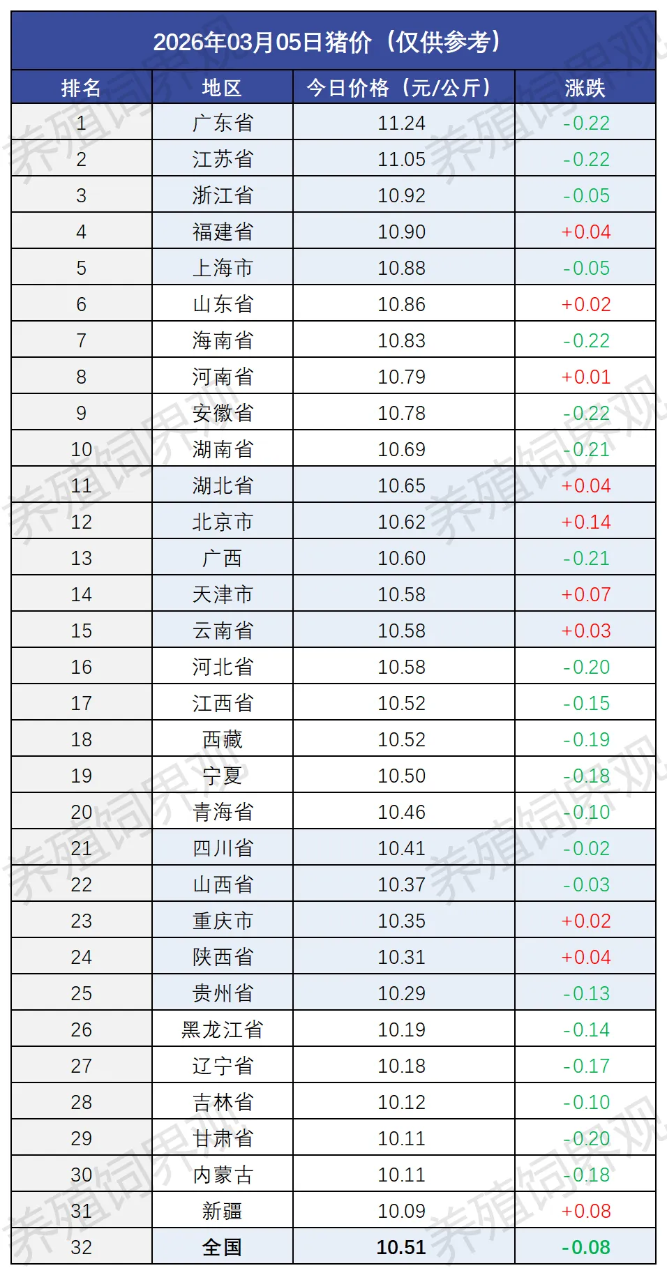 目前全国最高价为广东省,价格为11.24元/公斤,较昨日下跌0.22元/公斤;全国最低价为新疆,价格为10.09元/公斤,较昨日上涨0.08元/公斤。