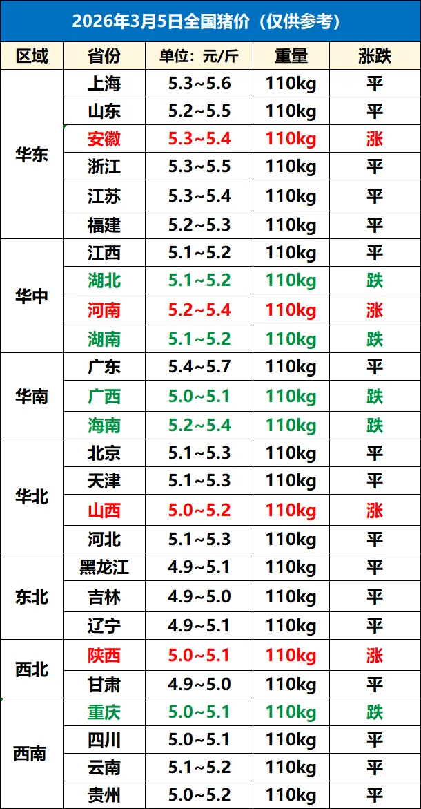 3月5日全国猪价一夜升温,上涨“猛抬头”!惊蛰到,愿您蓄力爆发,一路向上. 养羊网 2026-03-05 3月5日全国猪价一夜升温,上涨“猛抬头”!惊蛰到,愿您蓄力爆发,一路向上. 养羊网 2026-03-05 上一篇:【柯恩·今日猪价】3月4日生猪价格 下一篇:【明天猪价】 2026 3. 6 全国猪价!! 您可能还会对下面的文章感兴趣111: 相关文章 牧原10月份数据? 近期价格更新!!! 这鸡蛋价格是3.29/kg?还是3.29/500g? 正宗农散养土鸡蛋