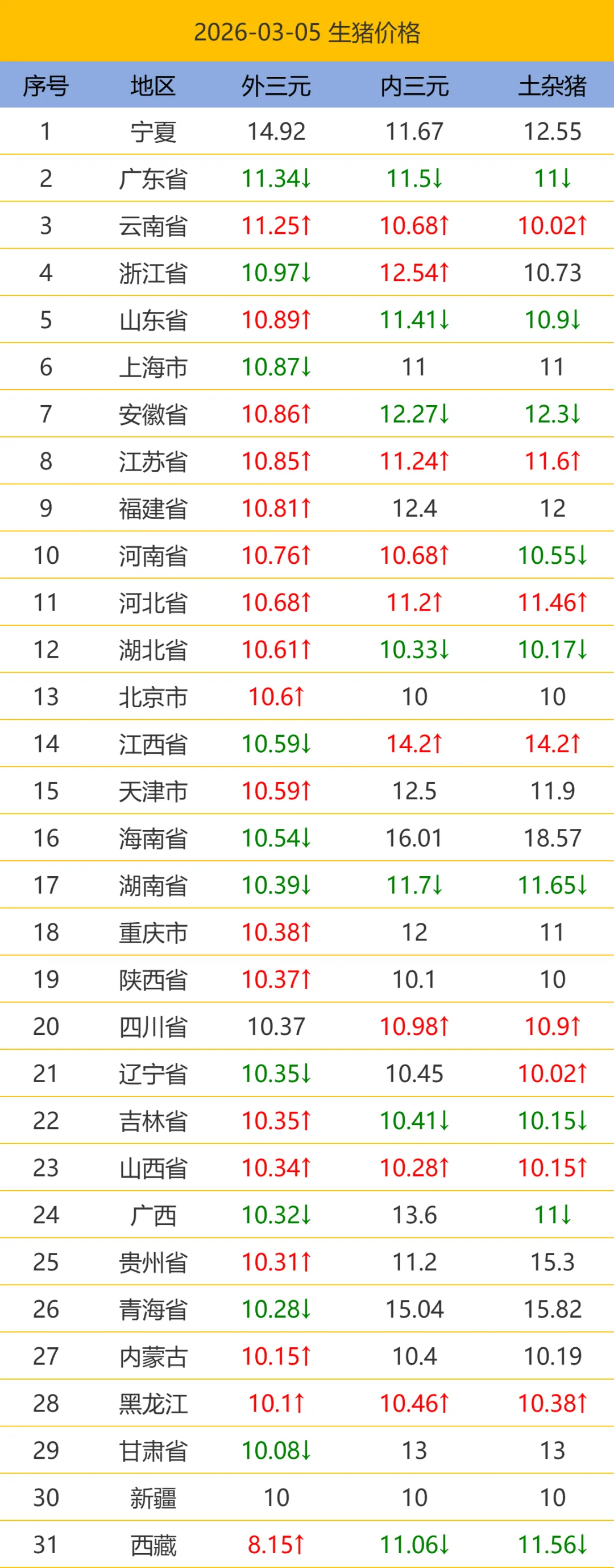 2026.03.05最新生猪价格.今日猪价,全国猪价. 养羊网 2026-03-05 2026.03.05最新生猪价格.今日猪价,全国猪价.以下猪价为平均价格(单位:元/公斤),市场时刻变动,报价不作交易依据,仅供参考。【需要更详细信息请到小程序查看】 养羊网 2026-03-05 上一篇:2026年3月6日 全国猪价 下一篇:【猪价早报】2026. 3 . 5 全国猪价! 您可能还会对下面的文章感兴趣111: 相关文章 羊腿 猪价低迷之下,谁在被淘汰?2026年养猪业真正危险的不是散户,而是这两种人! 品牌分享|MARRKNULL 2023AW 「丛林」 一个人的碎碎念之院子