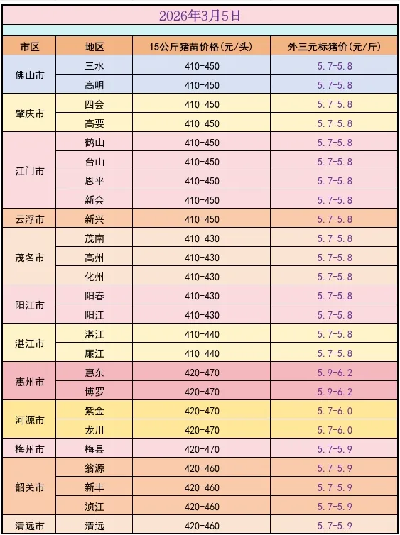 3月5日猪价速递 养羊网 2026-03-05 3月5日猪价速递广东猪苗全省各报410~470元,毛猪报5.7~6.2元,全省各地价格微跌0.1元。(行情仅供参考) 养羊网 2026-03-05 上一篇:明天猪价3.6 下一篇:2026. 3. 6猪价! 您可能还会对下面的文章感兴趣111: 相关文章 自己养的波尔山羊 从暴涨到暴跌,中国养猪网猪肉起伏未来展望 朋友们,明天中午宰羊预定啦(不包邮) 近期价格更新!!!