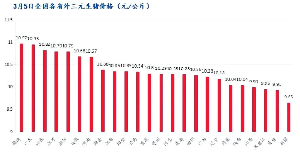 今天全国外三元生猪出栏均价为10.35元/公斤,较昨日下跌0.03元/公斤,最低价新疆9.65元/公斤,最高价福建10.97元/公斤。