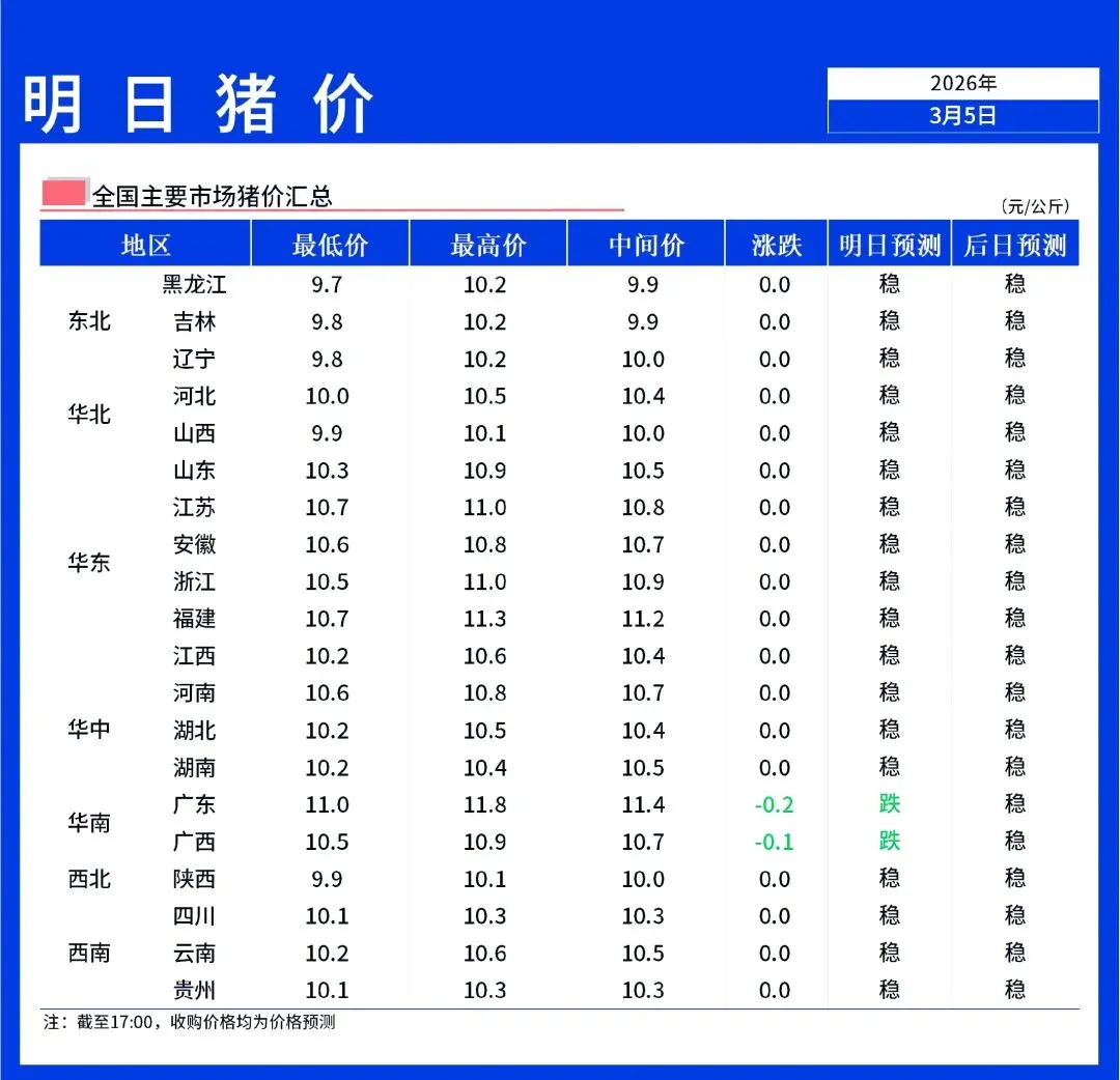 【明天猪价】3月6日全国猪价趋稳,难涨难跌!