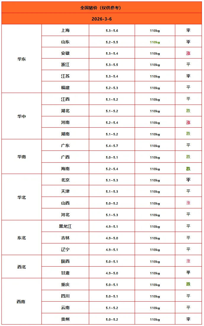 2026年03月06日全国猪价行情表 养羊网 2026-03-05 2026年03月06日全国猪价行情表以上内容源于网络,如有侵权请与我们联系,将及时删除。来源丨 畜禽报价 养羊网 2026-03-05 上一篇:春季养羊必不可少的七件大事! 下一篇:2026.3.6 猪价 您可能还会对下面的文章感兴趣111: 相关文章 山姆-焦糖鸡蛋布丁杯 在线等,我这只小羊30元贵不贵呀? 7月5日最新小麦玉米价格 第39篇:什么是【猪周期】?