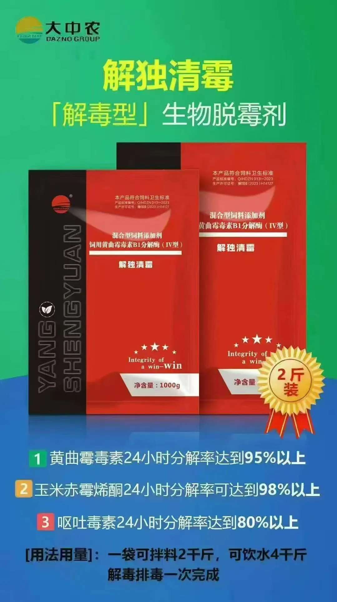 1000g/袋,15袋/件,每袋拌料2000斤,饮水4000斤