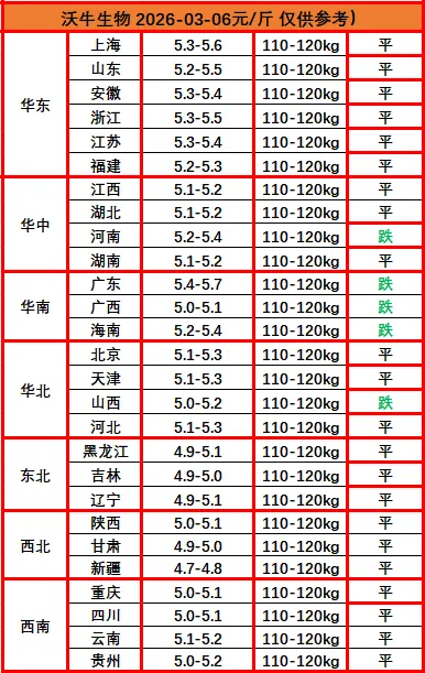 ? ?猪价播报沃小牛,助力养猪牛牛牛!各位养猪的老铁们,大家好!我是沃小牛,明天是2026年03月06日,最新猪价已经出来了:明天全国猪价呈现一马平川的姿态,收储信息虽然有止跌作用,但不足以解决长期积累的供需严重不平衡,需要通过长期的产能去化才能达到期待的周期状态。华东、华北、华中多数省份价格维持平稳,而南方部分地区如广东、广西、海南及河南、山西等地出现小幅下跌,跌幅在0.1-0.2元/斤左右。全国均价维持在5.0-5.3元/斤的低位区间,整体缺乏明显上涨动力,市场情绪偏谨慎,消费端支撑不足,出栏节奏相对平稳,短期猪价或延续震荡偏弱格局。