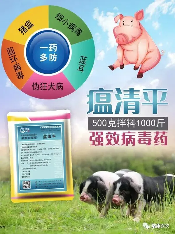 4、药物预防:养大于防,防大于治,平常的预防保健一定不能少,这里推荐大家使用瘟清平,多效合一强效病毒药,精心选用升麻,黄柏、栀子、板蓝根、大青叶、石膏、玄明粉、金银花、连翘、黄芪、党参、茯苓等,精心调配,多次提纯,能够有效净化蓝耳圆环病毒,能修复受损的免疫器官解除免疫抑制。其抗菌效果不受pH影响,优于山梨酸、苯甲酸、对羟基苯甲酸酯等。)