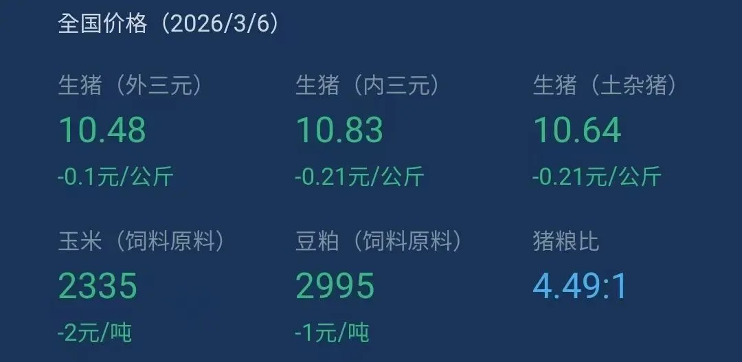 一、今天(2026年3月6日)全国生猪标准体重平均价格10.3-11.2元/公斤,同比昨日(2026年3月5日)价格下跌0.1元/公斤。
