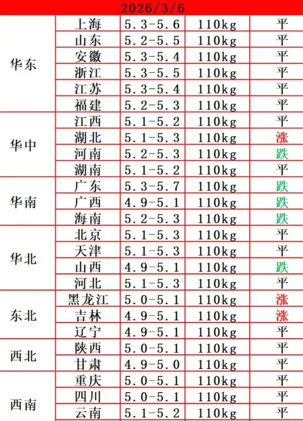 【柯恩·今日猪价】3月6日生猪价格 养羊网 2026-03-06 【柯恩·今日猪价】3月6日生猪价格全国统一咨询热线:4001-116-116需要饲料请拨打订货热线赣州:0797-8462111南昌:0791-85776699漳州:0596-6831299常德:0736-5696855茂名:0668-7303717 养羊网 2026-03-06 上一篇:猪价分析:自繁自养亏损超200元 下一篇:3月6日全国猪价 | 还在跌!全国28省飘绿,一地已跌入9元! 您可能还会对下面的文章感兴趣111: 相关文章 近期价格更新!!! 【超前猪价大预测】1月31日~2月3日!养殖户需理性看待这一阶段的涨跌,合理安排出栏节奏 成功买到无腥? 关税加了鸡蛋没了,鸡蛋能阻止特朗普吗?