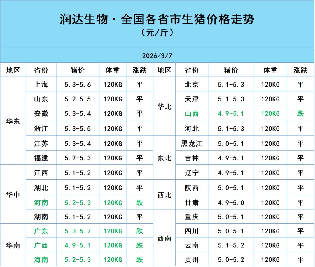 2026年3月7日明日猪价行情:猪价维稳! 养羊网 2026-03-06 2026年3月7日明日猪价行情:猪价维稳!免责申明:本微信服务平台资料来源于网络收集,以供给大家学习、交流为目的,请诸位在阅读后,尽快删除,尊重资料原作者,支持正版。若所列资源侵犯了您的权益请直接留言,立刻删除! 养羊网 2026-03-06 上一篇:3月6日全国早间猪价【稳定为主】 下一篇:重磅!国家出手“托市”,连跌的猪价要“刹车”了?养殖户速看! 您可能还会对下面的文章感兴趣111: 相关文章 中国辽宁五线小城市超市鸡蛋价格。要过年了 鸡蛋 eggs对下账 不管是味道还是价格都太权威了 2025年4月13日全国各地生猪价格信息