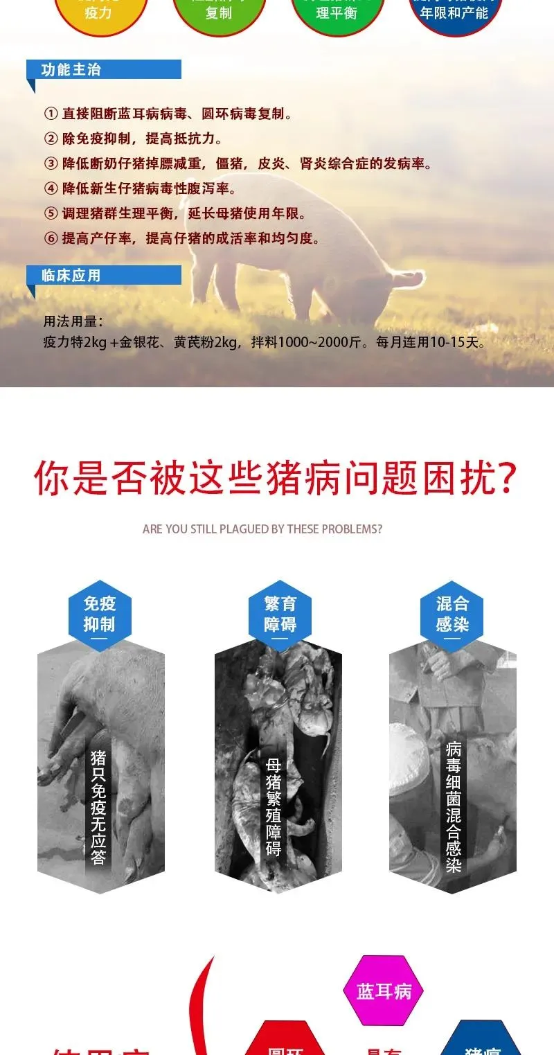 ?《病毒净?化包》十几年经久不衰,靠的就是回头客!特异性针对5大毒病?猪瘟、蓝耳、圆环、伪狂犬、口蹄疫,非特性异?提高机体疫免?力。减少猪?体内的野毒,提高机?体免疫力?!
