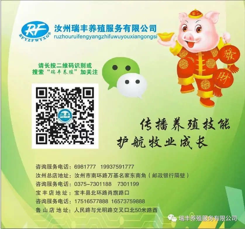 汝州瑞丰养殖服务有限公司成立于2003年,是一家销售兽药,疫苗,饲料为主的养殖服务企业,公司成立二十多年来,本着客户至上,以信誉求发展,以服务赢市场的服务原则。领先的疫病防控技术方案,高品质的产品品质,快捷高效的服务赢得了养殖朋友们一致好评!?精诚服务平顶山区域上千家养殖场。