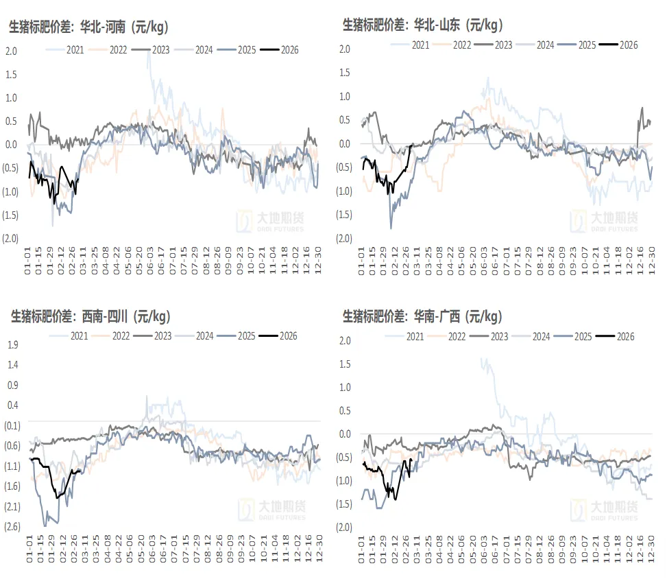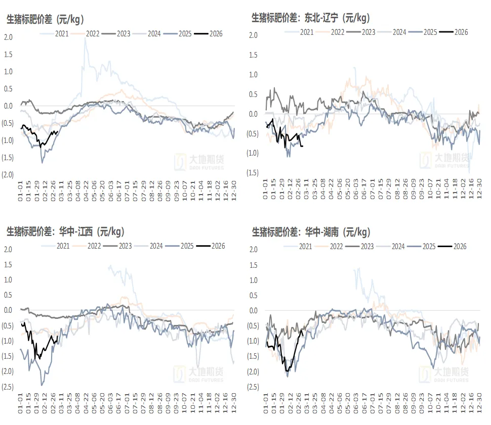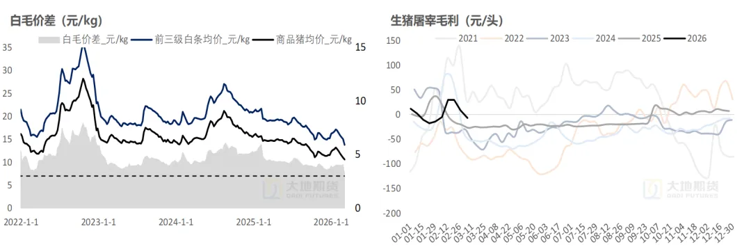 肥标价差高位走缩,且部分地区有倒挂出现。节后大猪需求转弱,加之前期尚有存栏未出清,市场供应增加,大猪价格较标猪表现更弱,肥标走缩。这种情况下,也有点抑制了二育投机补栏的积极性。