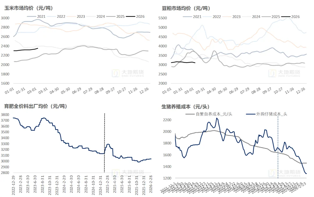 玉米:截至3月5日,玉米现货均价2350元/,较前周+20元/吨,环比+0.86%,同比+6.92%;豆粕:截至3月5日,豆粕现货均价3106元/吨,较前周-35元/吨,环比-1.11%,同比-12.16%。