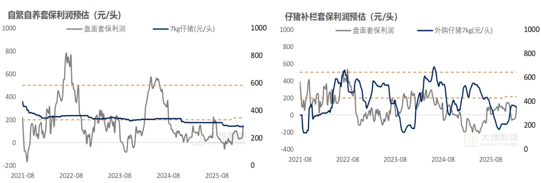套保利润:当前仔猪对应远月出栏合约09周内偏弱调整,外购仔猪补栏成本微降,远期粗算理论补栏利润周内小降。自繁自养套保利润当前预估利润在150元/头左右,较前周降13元左右;外购仔猪补栏套保利润预估约83元/头左右,头均较前周降3元左右。