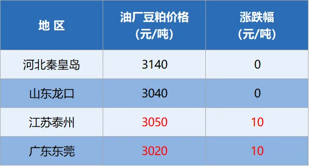 今日全国重要地区油厂豆粕(43%蛋白)价格